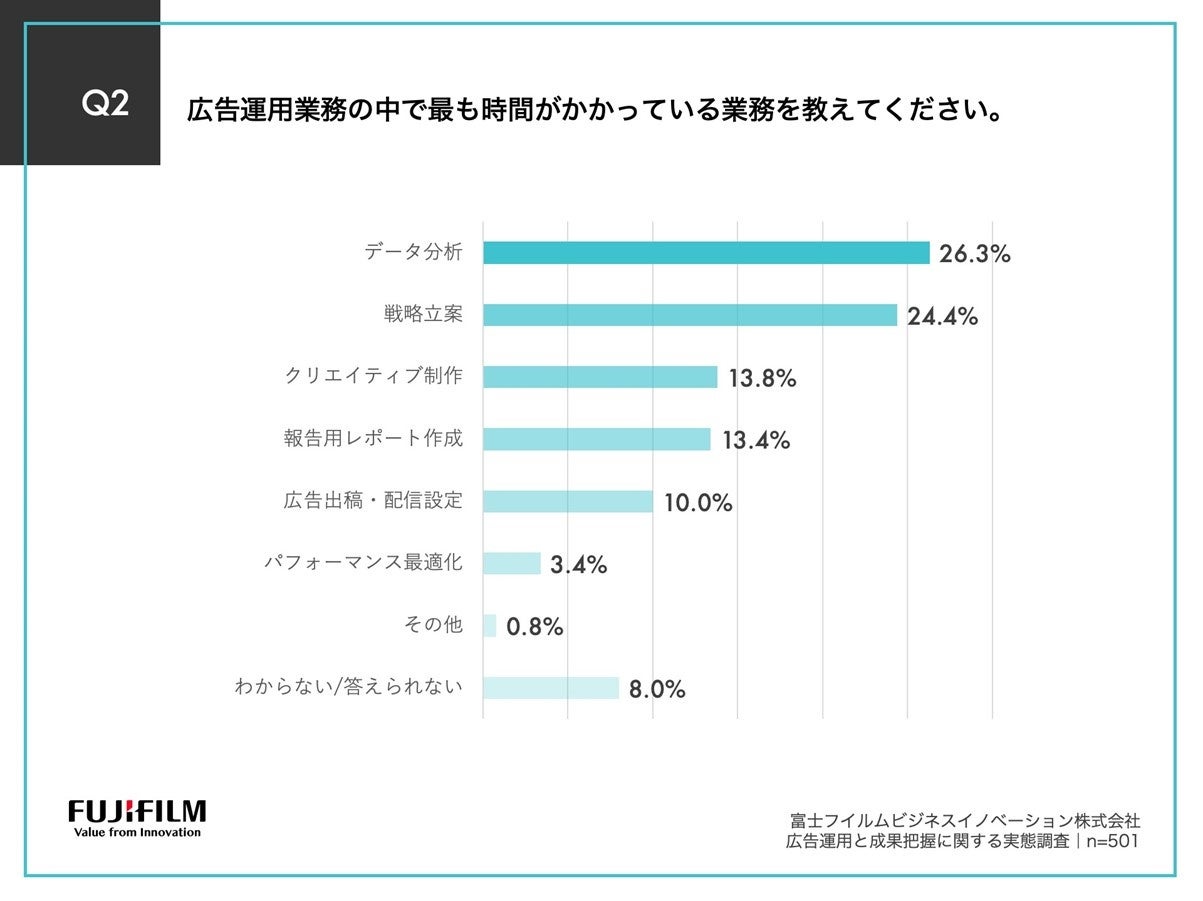 「Q2.広告運用業務の中で最も時間がかかっている業務を教えてください。」(n=501)と質問したところ、「データ分析」が26.3%、「戦略立案」が24.4%、「クリエイティブ制作」が13.8%という回答となりました。