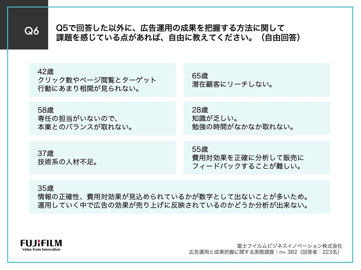 Q5で「わからない/答えられない」以外を回答した方に、「Q6.Q5で回答した以外に、広告運用の成果を把握する方法に関して課題を感じている点があれば、自由に教えてください。(自由回答)」(n=382)と質問したところ、「クリック数やページ閲覧とターゲット行動にあまり相関が見られない」や「技術系の人材不足」など223の回答を得ることができました。