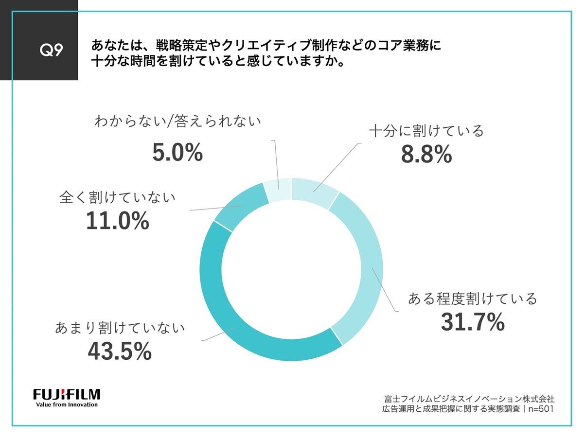「Q9.あなたは、戦略策定やクリエイティブ制作などのコア業務に十分な時間を割けていると感じていますか。」(n=501)と質問したところ、「あまり割けていない」が43.5%、「全く割けていない」が11.0%という回答となりました。