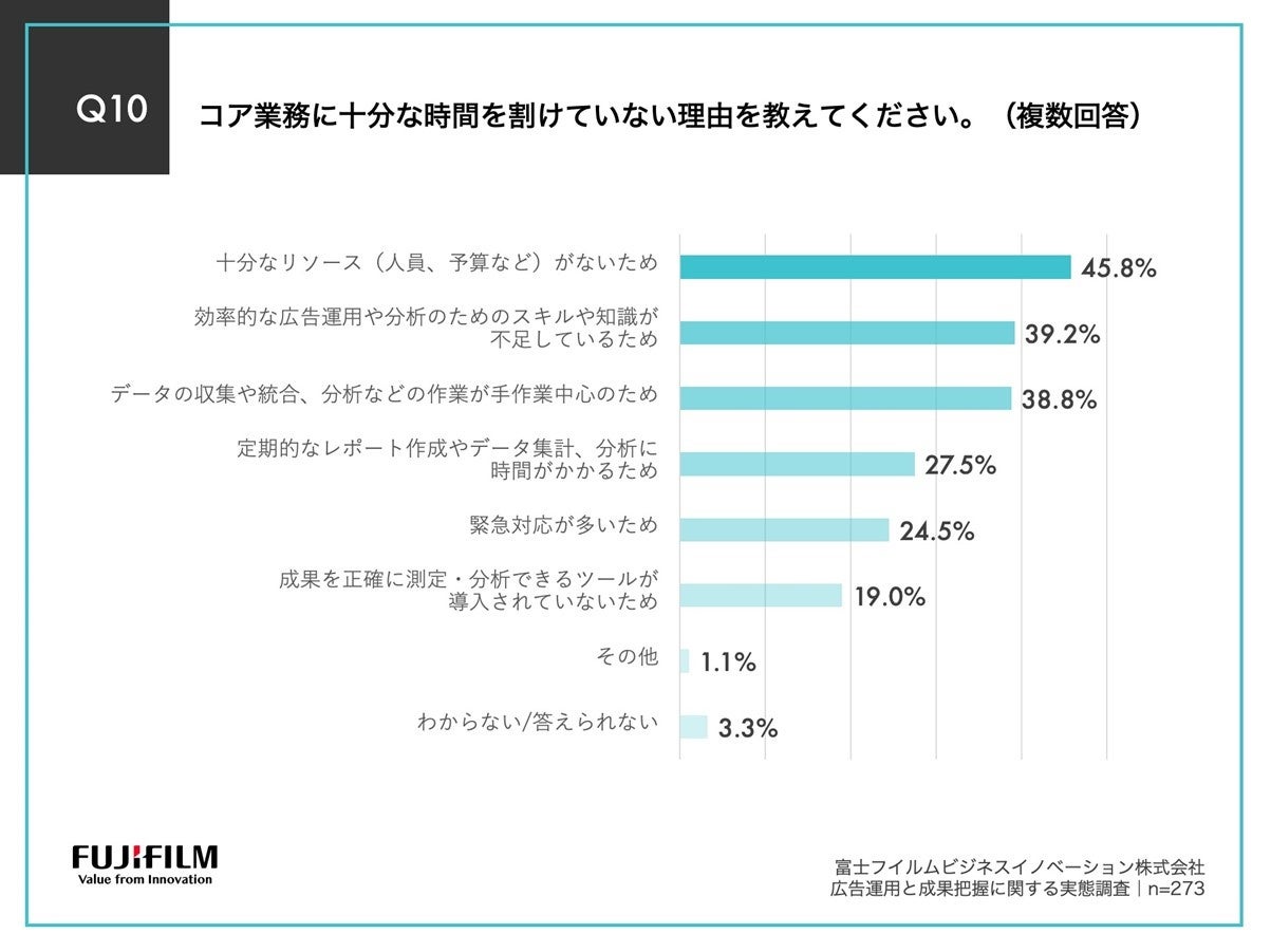 Q9で「あまり割けていない」「全く割けていない」と回答した方に、「Q10.コア業務に十分な時間を割けていない理由を教えてください。(複数回答)」(n=273)と質問したところ、「十分なリソース(人員、予算など)がないため」が45.8%、「効率的な広告運用や分析のためのスキルや知識が不足しているため」が39.2%、「データの収集や統合、分析などの作業が手作業中心のため」が38.8%という回答となりました。