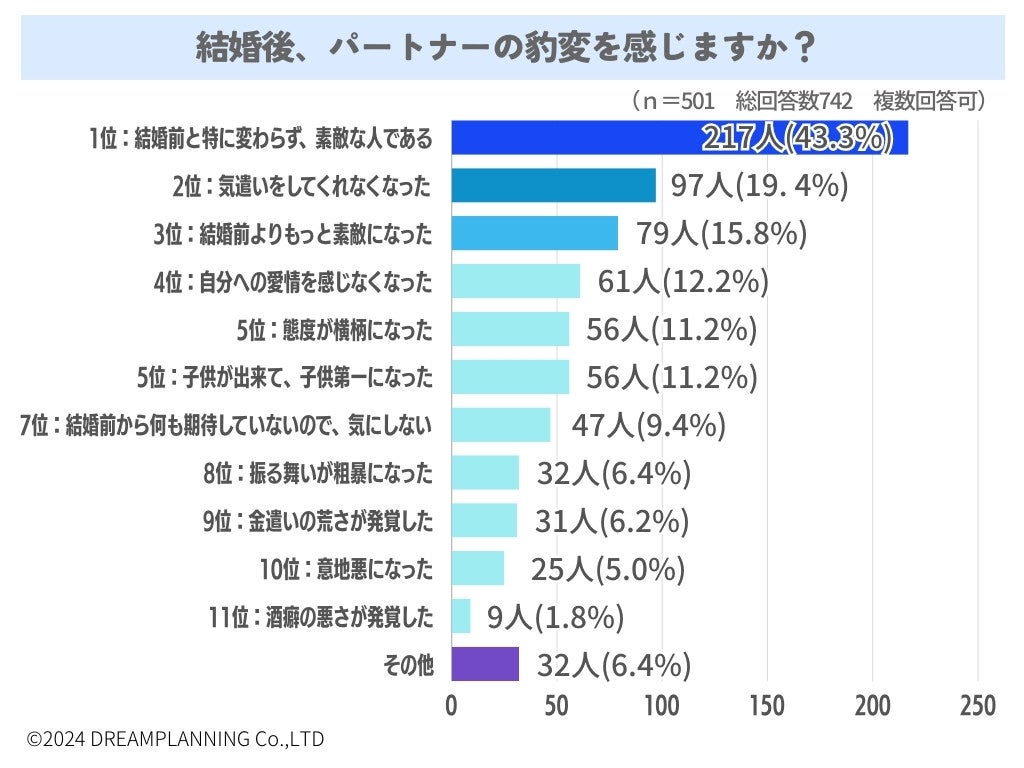 ★ 1位:結婚前と特に変わらず、素敵な人である 217/501名(43.3%) ★