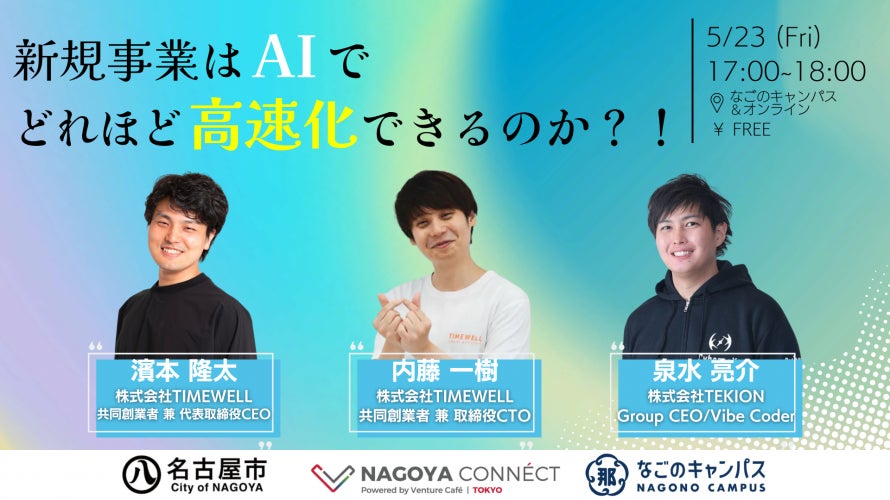 株式会社TIMEWELL(本社:神奈川県横浜市、代表取締役:濱本隆太、以下「TIMEWELL」)はNAGOYA CONNÉCTの1コマとして「新規事業はAIでどれほど高速化できるのか?!」を開催することをお知らせします。当日は弊社代表取締役CEO濱本とCTO内藤も登壇予定です。