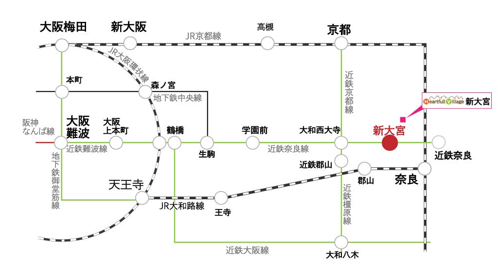 快速・急行停車駅の近鉄奈良線「新大宮」駅まで、徒歩約9分。奈良市内各地へも、大阪・京都・神戸方面へもつなぐ優れた環境。
