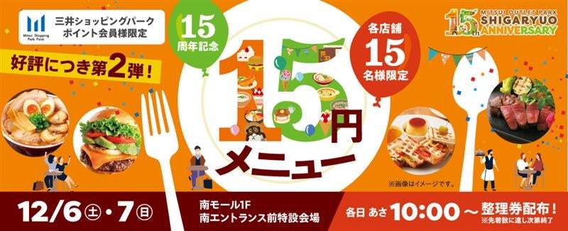 三井アウトレットパーク 滋賀竜王では、12月6日(土)と12月7日(日)の2日間、館内飲食店対象17店舗の人気メニューを、各店15名様限定で15円(税込)にてご提供します。
