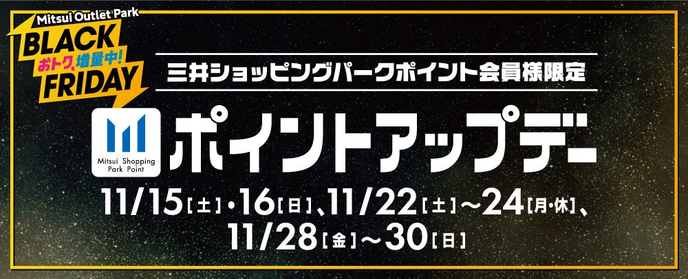 11月15日(土)から11月16日(日)、11月22日(土)から11月24日(月・休)、11月28日(金)から11月30日(日)の計8日間、100円(税抜)につき最大15ポイントが付与される三井ショッピングパークポイント ポイントアップデーを実施します。