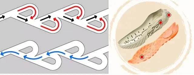 正方向の「テスラバルブ」は靴内の高温多湿な空気を素早く排出し、逆方向では「遮断」され、外部の湿気が逆流しません。