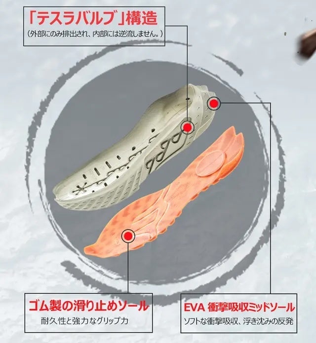 ソールに隠された「テスラバルブ」により、靴内の「高温多湿ガス」を靴外に排出します。激しい運動やウォーキングをしても靴内がムレにくく、常に快適です。