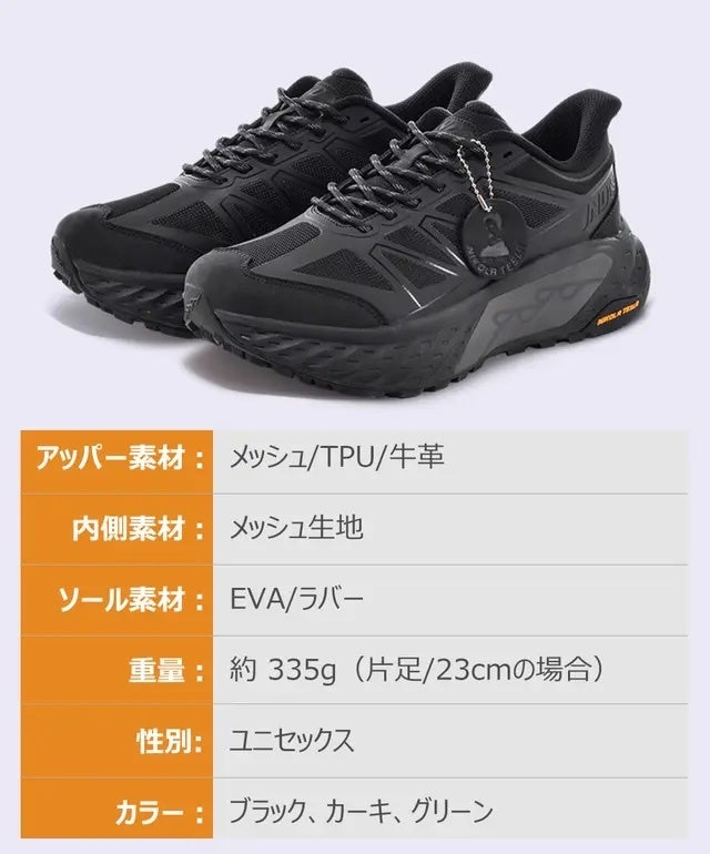 EVAミッドソールは柔らかく弾力性があり、衝撃吸収に主な役割を果たします。 ヒールの高さは3.5cm、前足部の高さは2cmで、適度な傾斜差が推進感を高め、歩行や運動を楽にスムーズにします。