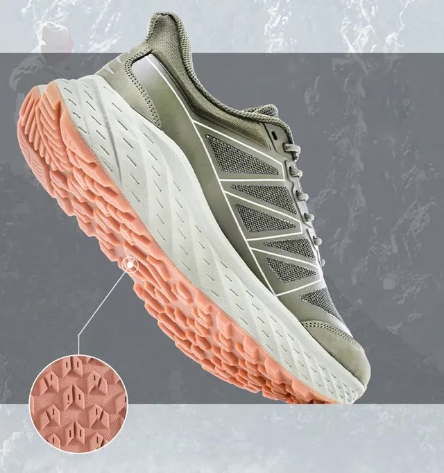 ゴム素材の凹凸がスーパーグリップ力をもたらし、登山や滑りやすい都市部の道路でも楽々対応します。