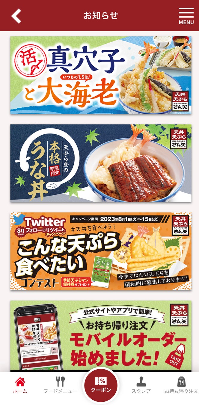 「天丼・天ぷら本舗 さん天」公式アプリの機能紹介