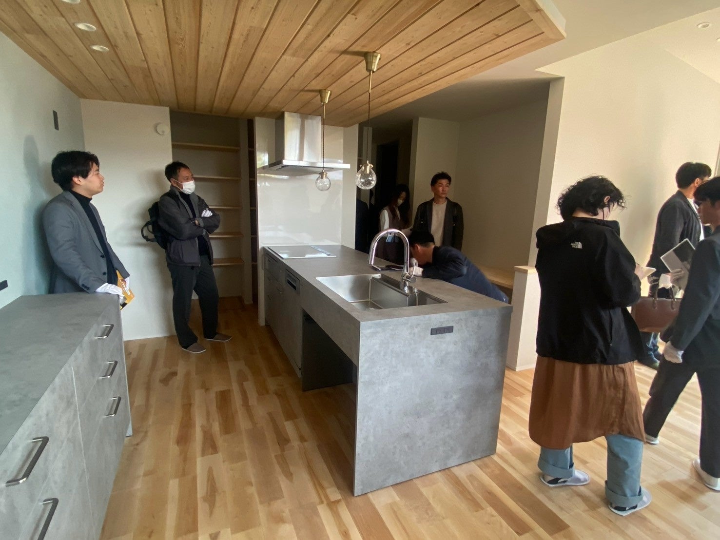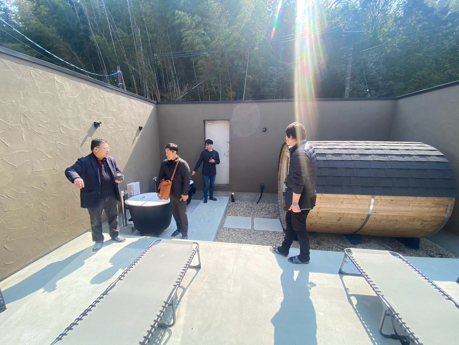 当日は、リブランディングで力を入れている平屋のモデルハウスや、建築家による自由設計の家施工現場を視察。建築家とのコラボレーションによって実現した、約5mの勾配天井や28.7帖の大空間LDK、浴室に隣接した室内サウナと屋外のバレルサウナに加え、「整いスペース」などを備えた近年人気の高まっているフィンランド式サウナなど、こだわりを体現し差別化や高付加価値化を進めた空間設計と共に、モデルの活用方策や