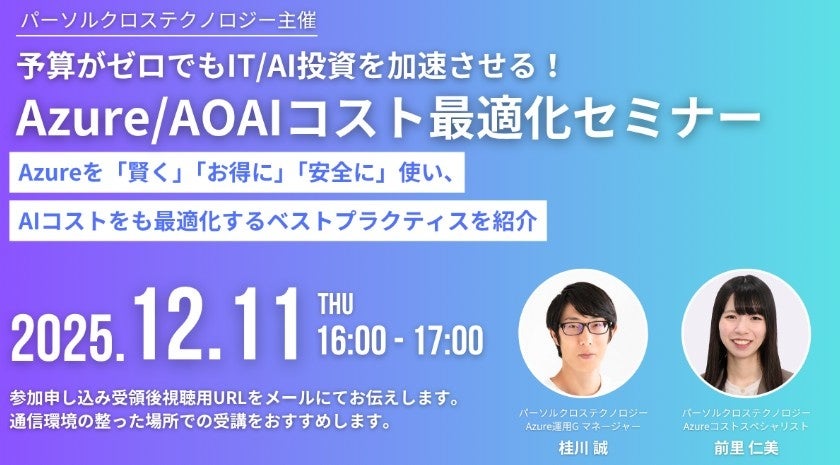 「はたらいて、笑おう。」をビジョンに掲げるパーソルグループで、テクノロジーソリューション事業を手がけるパーソルクロステクノロジー株式会社(本社:東京都新宿区、代表取締役社長:正木 慎二、以下:パーソルクロステクノロジー)は、Azure環境で進む生成AI活用の広がりに伴い、AI利用に関わるコスト管理を強化する新オプション「生成AIコスト最適化」を「Azureコスト最適化ソリューション」に追加しました。これに合わせて、Azureおよび生成AIの利用状況の見直し、運用改善の具体策を解説するセミナーを、12月11日と22日に開催します。