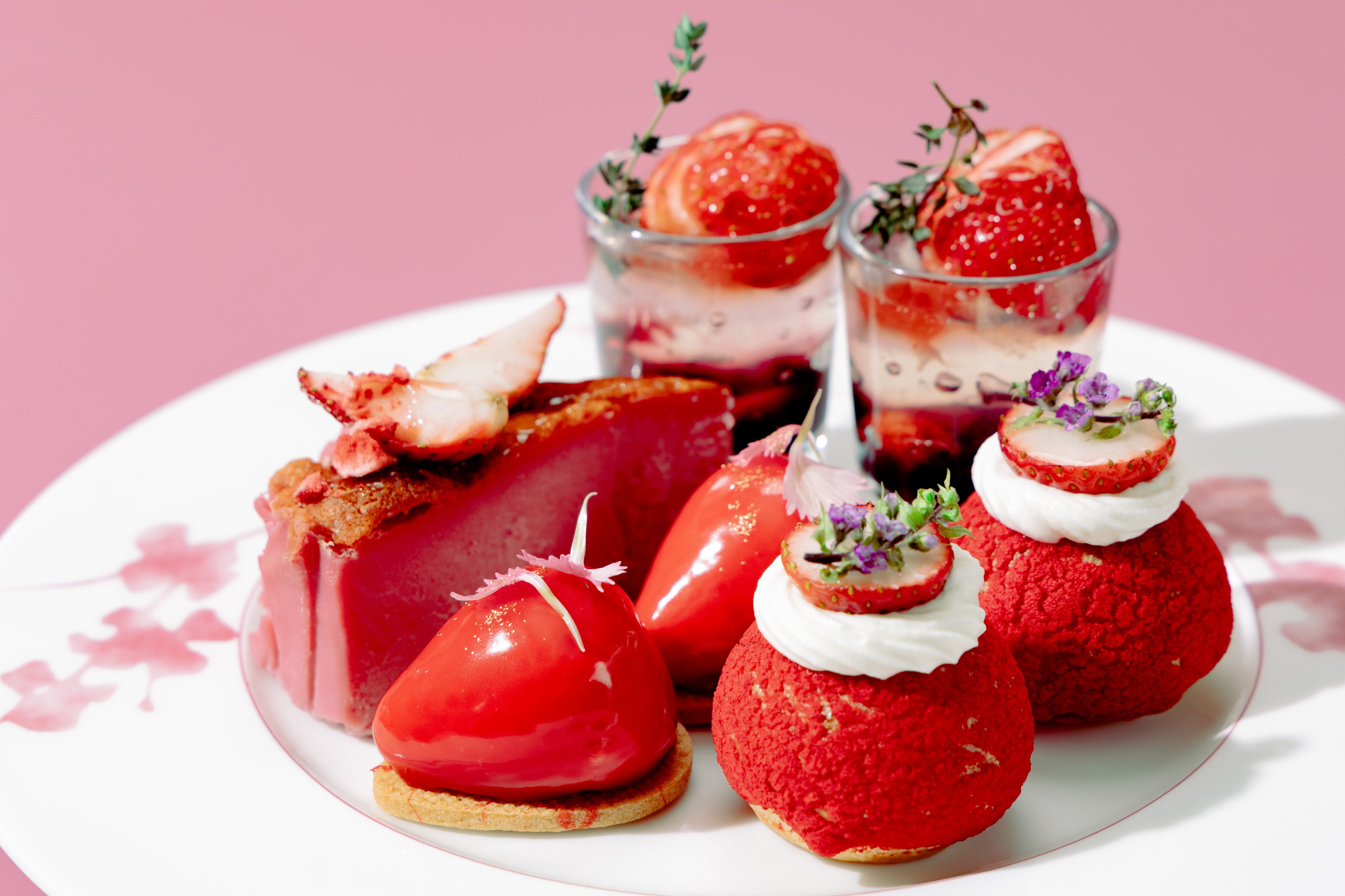 その他、鮮やかなピンク色のバスクチーズケーキや、爽やかな酸味がアクセントになるグラスデザートの「ストロベリーカシスコンポートとレモンのジュレ」など計4種のデザートをご用意