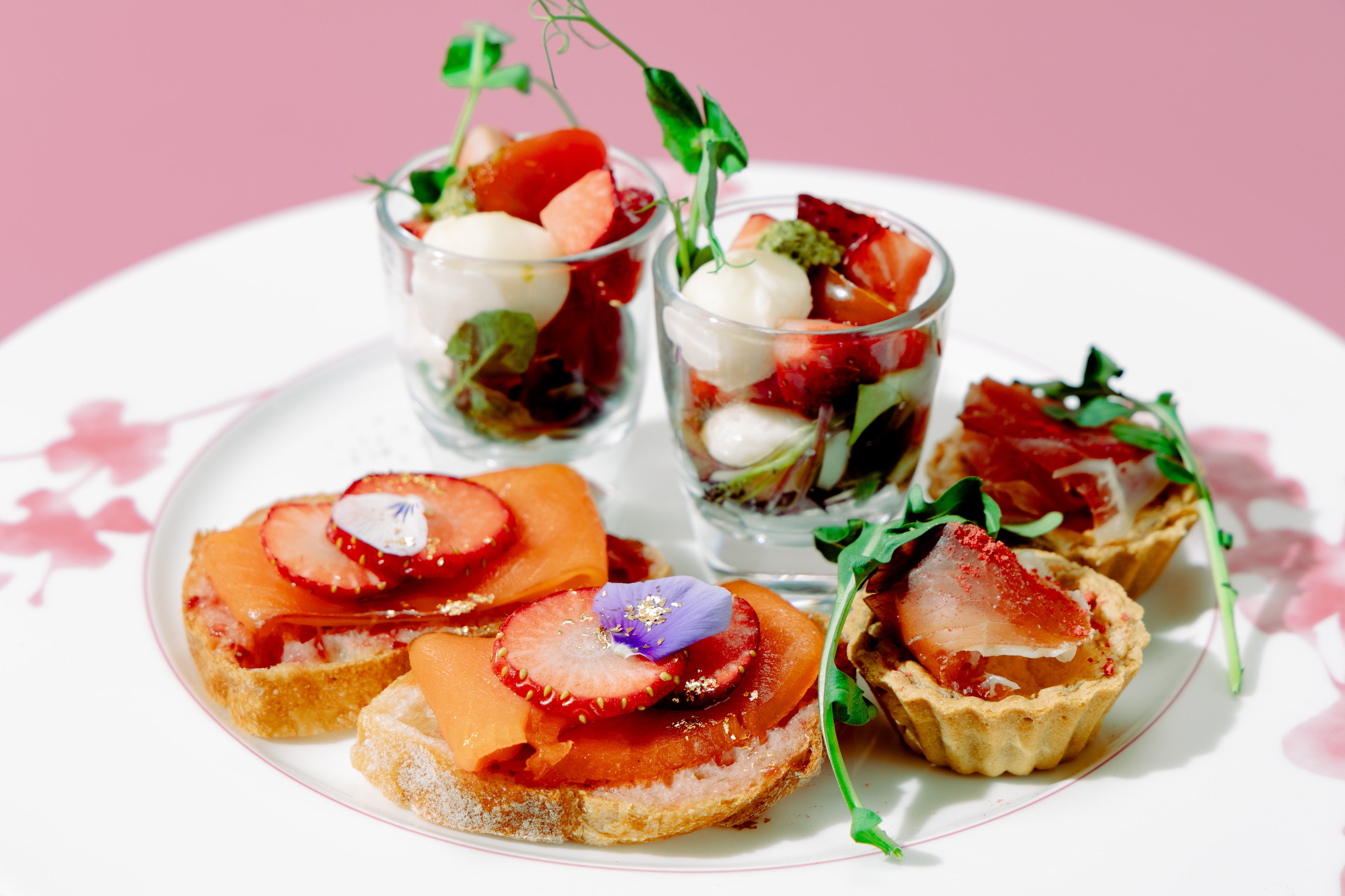 セイボリーにもいちごを贅沢に使用し、カプレーゼやブルスケッタでは、果実の甘酸っぱさとチーズやサーモンの塩味が絶妙なハーモニーを奏でます。スコーンはプレーンに加え、春らしいストロベリーチーズが登場。上段から下段まで、いちごの魅力を余すところなく詰め込んだティースタンドです。