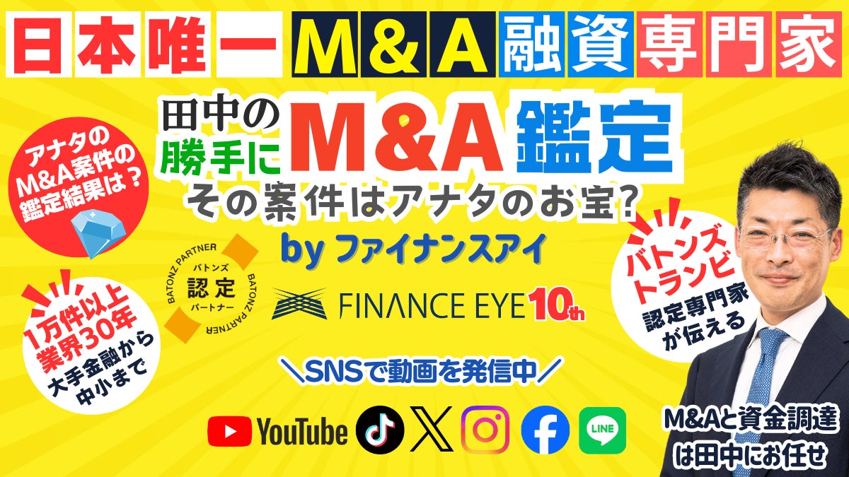 ■ファイナンスアイ公式サイト ■ファイナンスアイ公式SNS X(旧:Twitter):https://x.com/mandecmc YouTube:https://www.youtube.com/@financeeye Facebook:https://www.youtube.com/@financeeye LINE公式アカウント:https://lin.ee/mYXFDyr tiktok:https://www.tiktok.com/@financeeye instgram:https://www.instagram.com/financeeyenet/ note: https://note.com/financeeye ■個人でも失敗しないM&A|サブスクM&A https://financeeye.net/lp-ma-0001/ https://financeeye.net/lp-ma-far-1/ ■M&A・事業承継のサービス https://financeeye.net/service-ma-1/ ■ファイナンスアイ専門家サイト ★M&A成約数日本No.1 BATONZ(バトンズ)認定パートナー https://batonz.jp/experts/7833 ★国内最大級のM&AマッチングサイトTRANBI(トランビ)認定専門家 https://www.tranbi.com/expert/detail/?id=467 ★マイベストプロ認定専門家 https://mbp-japan.com/osaka/financeeye/ ★経産省発 日本最大級の起業家・経営者支援サイト |