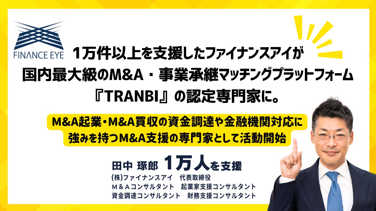 M&A起業や買収資金の資金調達や金融機関対応に強いファイナンスアイ、国内最大級のM&A・事業承継マッチグプラットフォーム『TRANBI(トランビ)』にてM&A認定専門家として活動