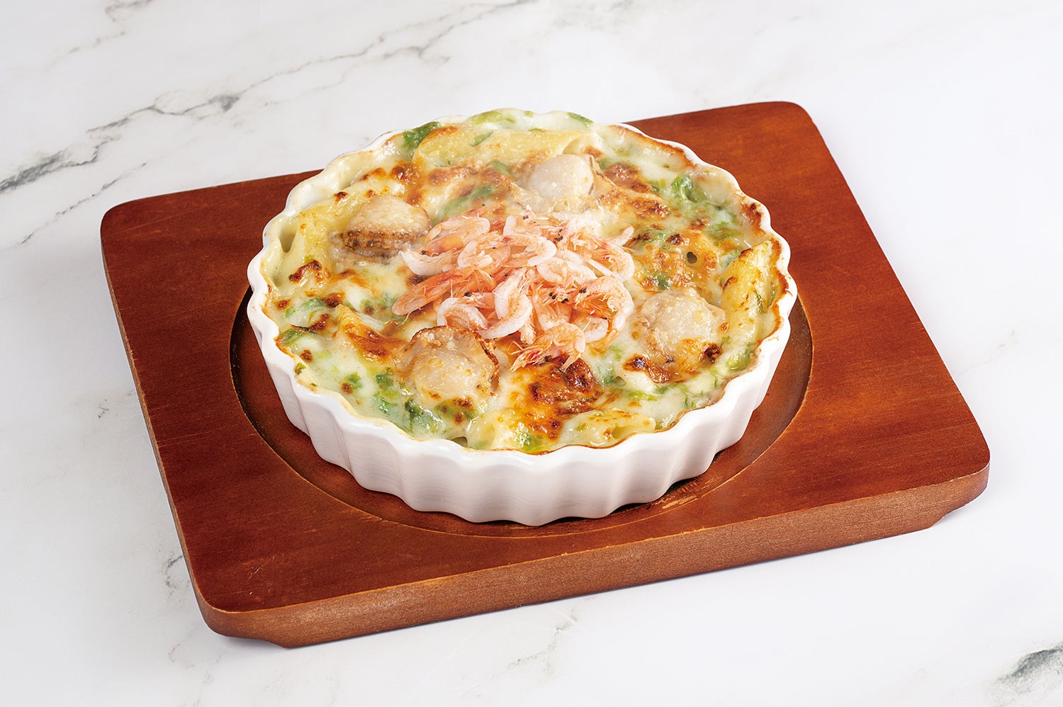香り豊かな磯の風味が口いっぱいに広がる、海の幸を詰め込んだ贅沢なグラタンです。