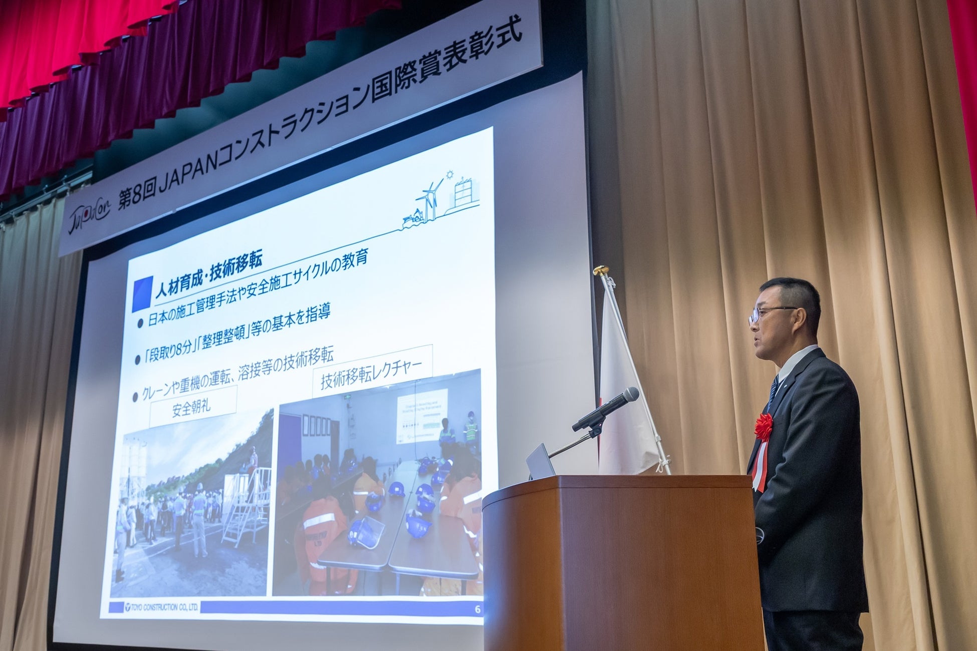 「JAPANコンストラクション国際賞」は、日系企業が海外で携わった「質の高いインフラ」プロジェクトのうち、特に人材育成や技術移転を通じて国際的に貢献するとともに、優れたノウハウや技術力を発揮した設計、施工、不動産開発等の日系企業に対し、表彰するものです。