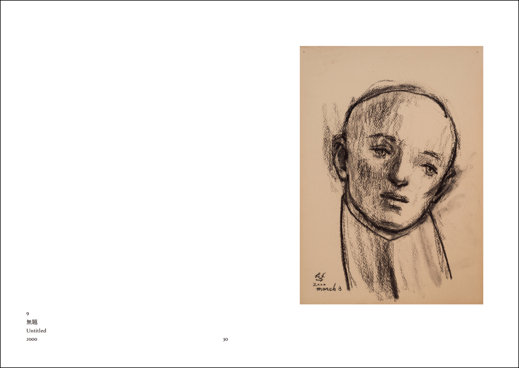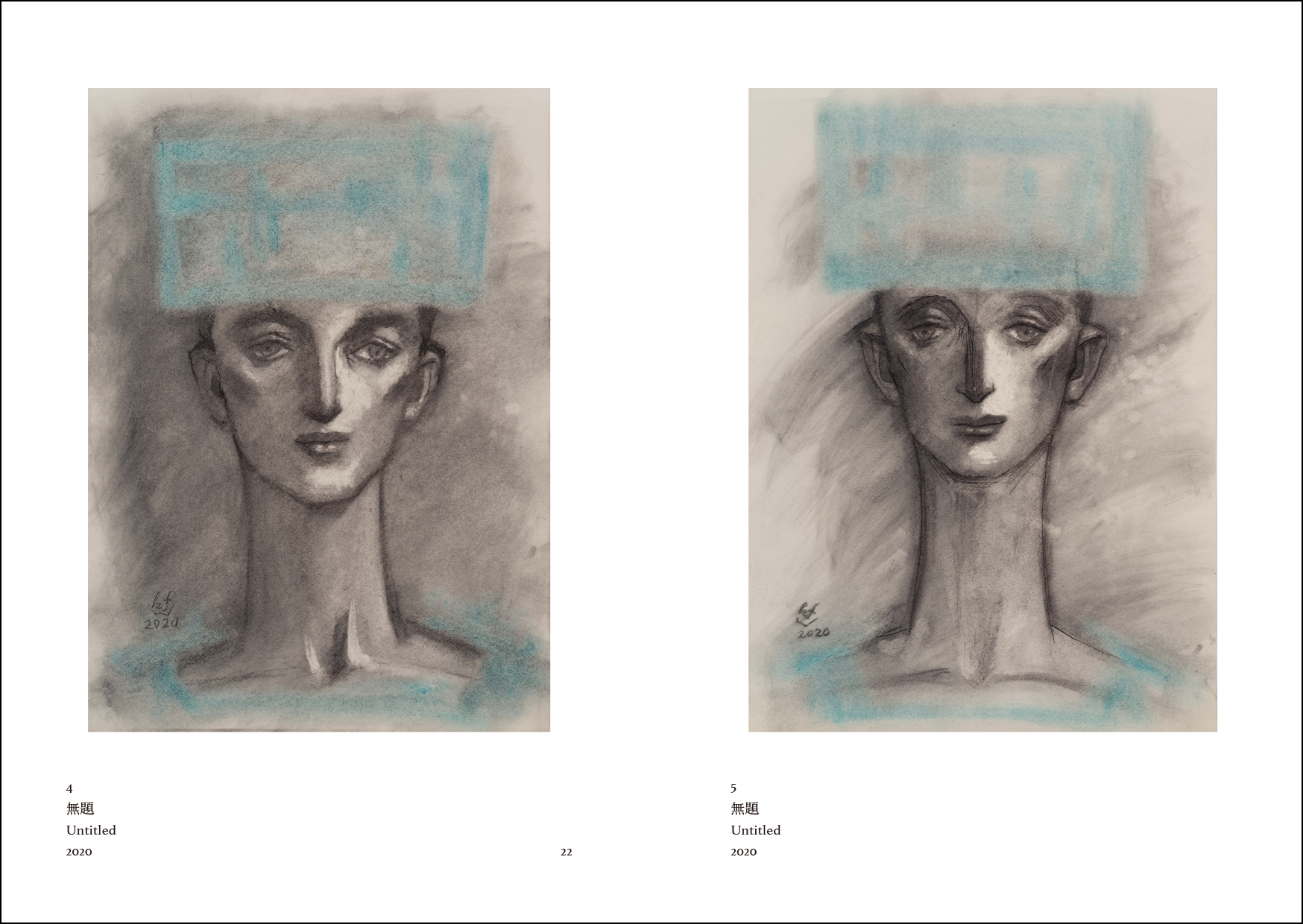肩ごしのぞく美しい手が印象的な作品《言葉をつかむ手》(2004)の、神秘的なモノクローム写真から始まる本書は、同じく片方の肩に手がついた女性のドローイング《手のある裸婦》(2004)、続けて《言葉をつかむ手》の新撮写真、ブルーのガラスを頭部に付けた女性像《青の書》(2017)、頭部に同様な色面を付けたドローイングと、つながりのある作品群が続き、以降、様々なドローイングがゆったりと展開していきます。美しく力強い線によるドローイングが存在感を放ちます。