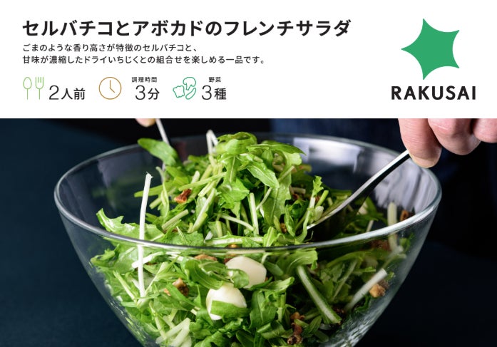 1.セルバチコとアボカドのフレンチサラダ(2人前) 2.たっぷりケールと根菜のサラダ(2人前) 3.RAKUSAIオンラインショップで使えるお得な500ポイント |
