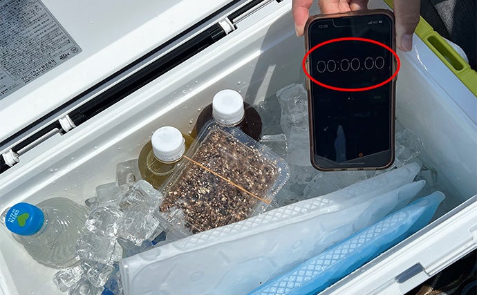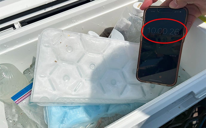 氷が入ったクーラーボックスにぬるくなったマットを入れると、わずか10分で再凍結されることを確認。