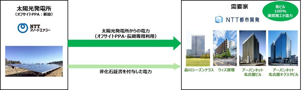 このたび、NTT都市開発株式会社(本社:東京都千代田区、代表取締役社長 池田 康、以下、「NTT都市開発」)は、保有するオフィスビルおよび複合商業施設計4ビル(品川シーズンテラス、ウィズ原宿、アーバンネット名古屋ビルおよびアーバンネット名古屋ネクスタビル)において、NTTアノードエナジー株式会社(本社:東京都港区、代表取締役社長 岸本 照之、以下、「NTTアノードエナジー」)と、追加性のある再エネを長期で調達するオフサイト型コーポレートPPA(以下、「オフサイトPPA」/