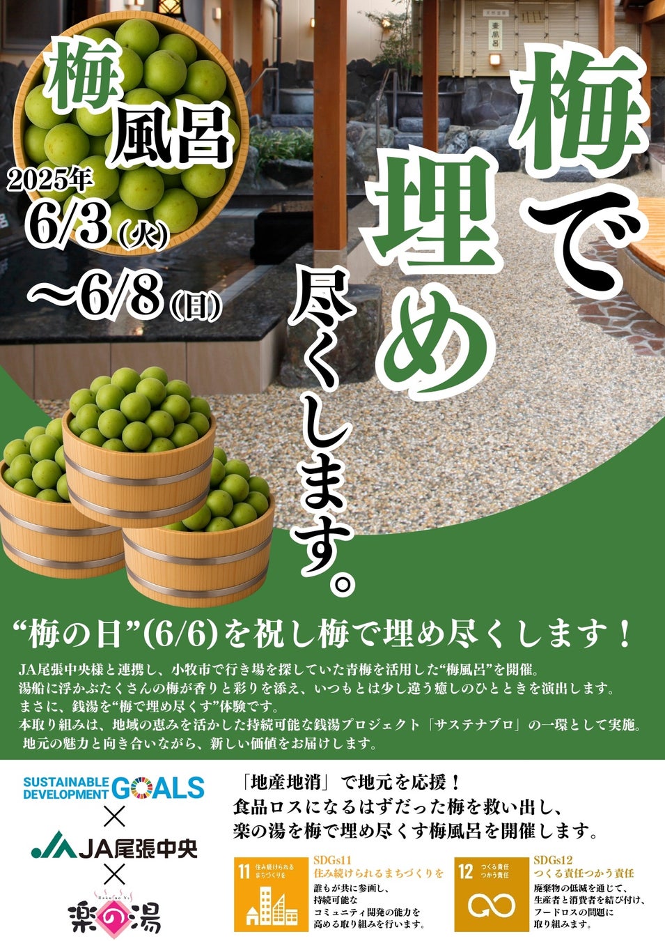 愛知県小牧市の「天然温泉こまき楽の湯」(運営:株式会社ナカシロ/本社:名古屋市守山区)は、2025年6月3日(火)から6月8日(日)まで、地元で行き場を失っていた青梅を活用した“梅風呂”イベントを開催します。6月6日の「梅の日」を記念した特別企画として、露天風呂に大量の梅を浮かべ、まさに“梅で埋め尽くす”体験をお届けします。