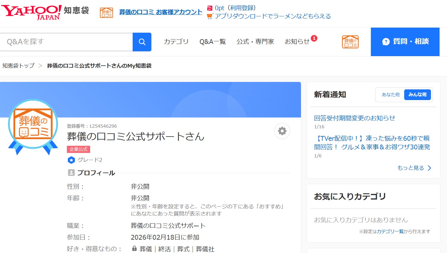 「Yahoo!知恵袋 企業公式アカウント 葬儀の口コミ公式サポート」