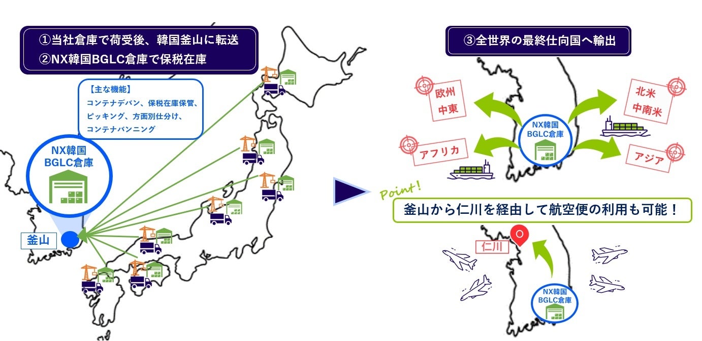 本サービスでは、日本通運の全国2,130拠点・1,050倉庫という国内最大級のネットワークを活かし、被災を免れた拠点や動線を活用して安定したサプライチェーンを確保します。日本各地の倉庫で荷受け・通関後、釜山へ転送。NX韓国の釜山港倉庫(NX韓国BGLC倉庫)をハブとし、保税在庫管理や仕分けを行い、欧米・アジア・中東・アフリカなど世界各国への輸送ルートを確保します。さらに、釜山から仁川空港を経由した航空便利用も可能とし、緊急時の多様な輸送ニーズに対応します。本サービスは、輸出だけでなく海外から日本への輸入にもご利用いただけます。