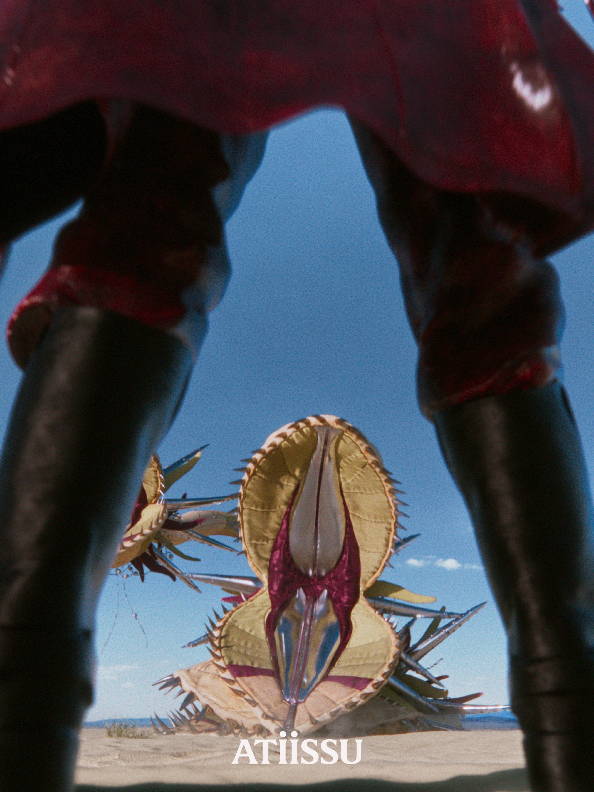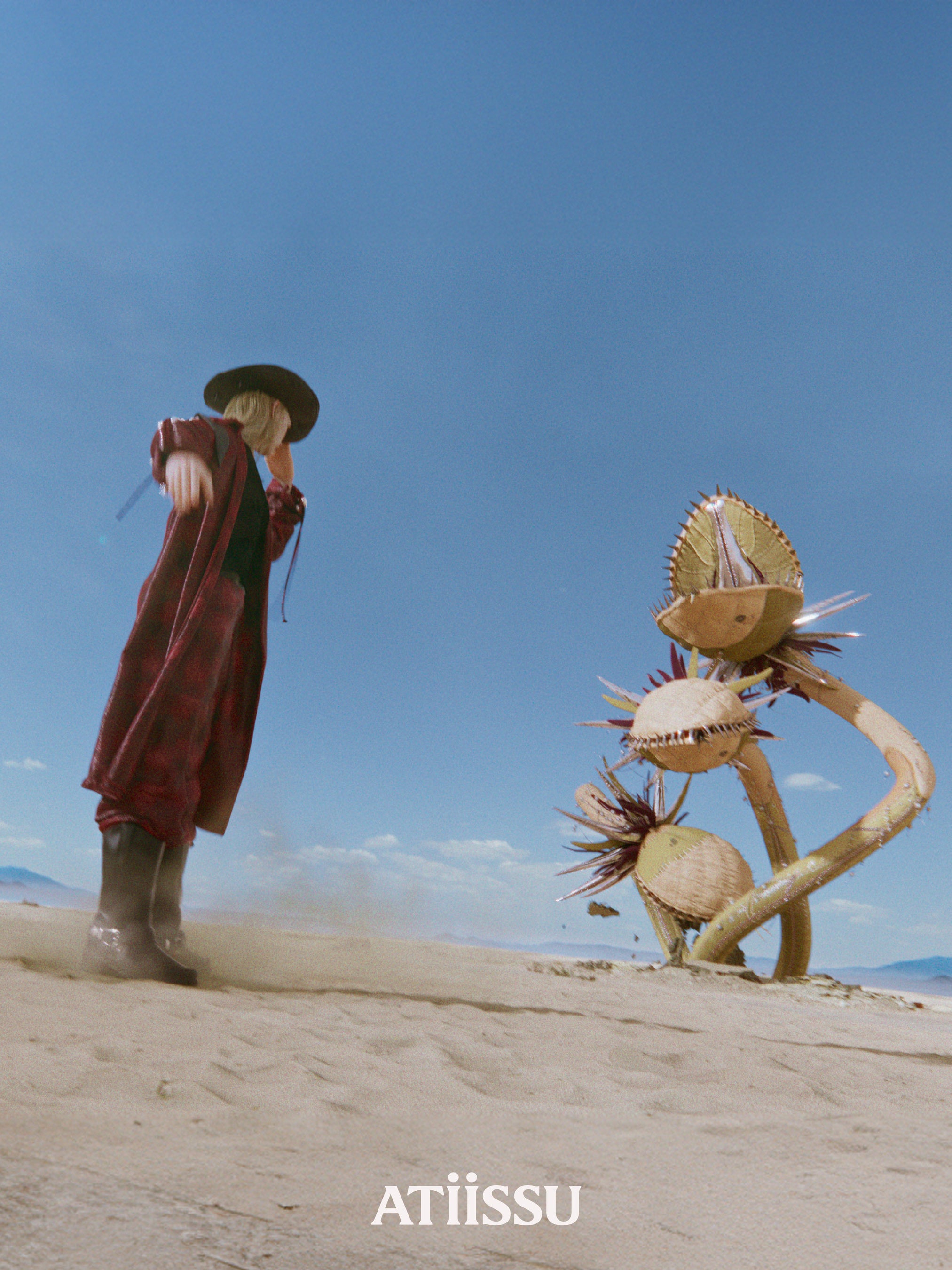 果てしなく続く砂の流れと揺らぐ熱気の中で展開される本キャンペーンは、異なる次元の境界が曖昧になった世界観の中、主人公であるStray KidsのFelixと未知の存在「ハエトリソウ」が対峙するスリリングな瞬間を描いています。ヘヴィメタルサウンドを基盤とした力強いパフォーマンスは、ATiiSSUの実験的な世界観をより鮮明に印象づけ、Stray KidsのFelixと「ハエトリソウ」のエネルギーの相互作用から生まれたレザーメタルヘッドウェアは、単なるアイテムを超えた新たなスタイルの可能性を提示しています。