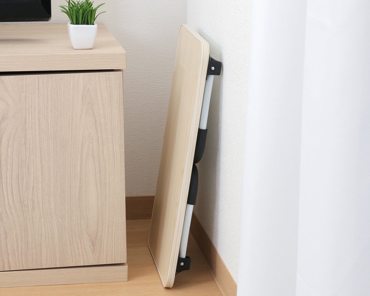 テーブルの脚が折りたためる仕様なので、使わないときはスリムに収納可能。厚みはわずか約4.5cmと、家具のすき間やちょっとしたスペースにも収まります。