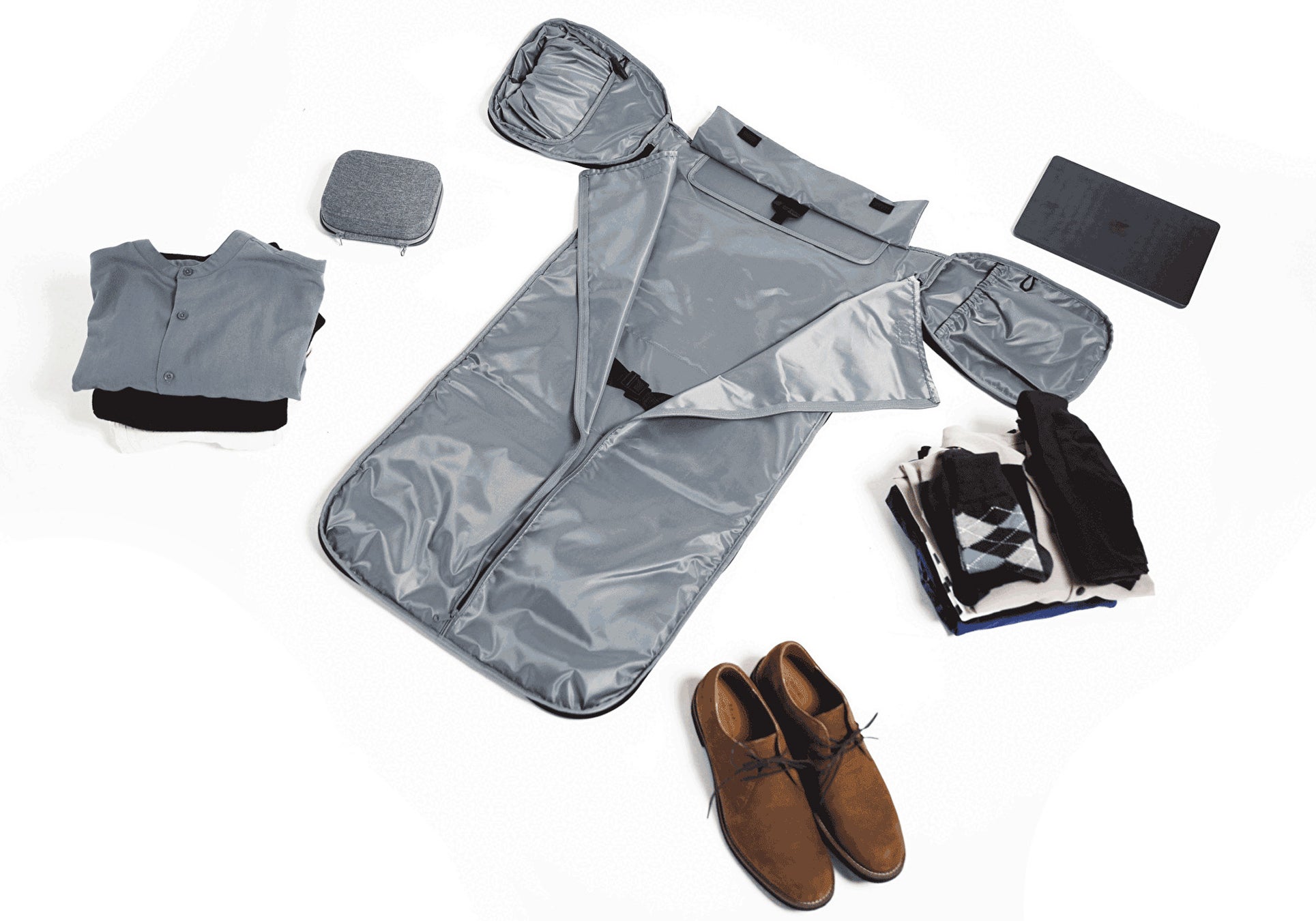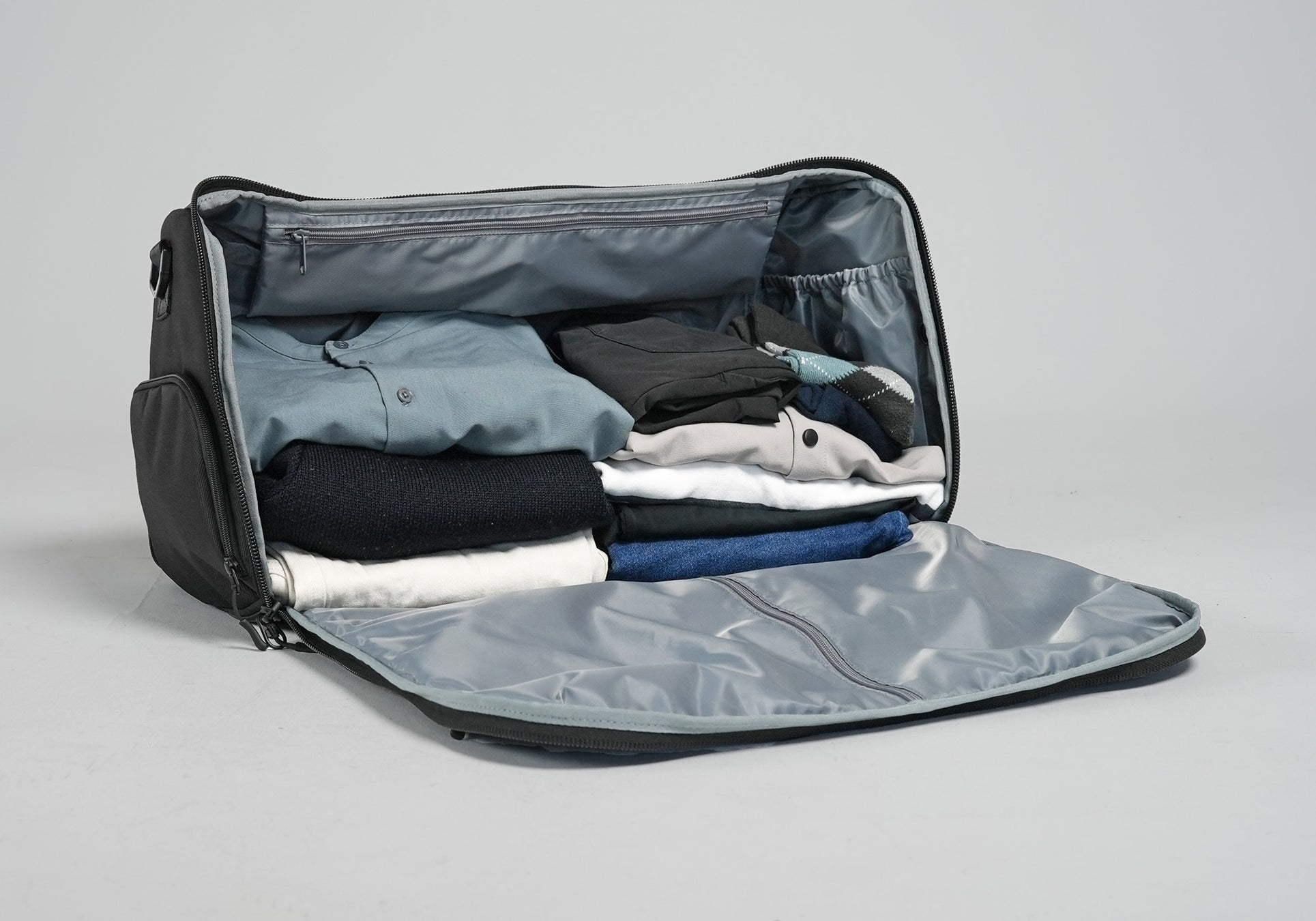 メインジッパーを開くだけで、バッグがフラットになり、スーツをそのまま入れられるガーメントバッグへと瞬時に変形します。出張や旅行先で、スーツのシワをもう気にしなくて済みます。さらに、使用しない時は平らに折り畳んで収納できるため、場所を取りません。