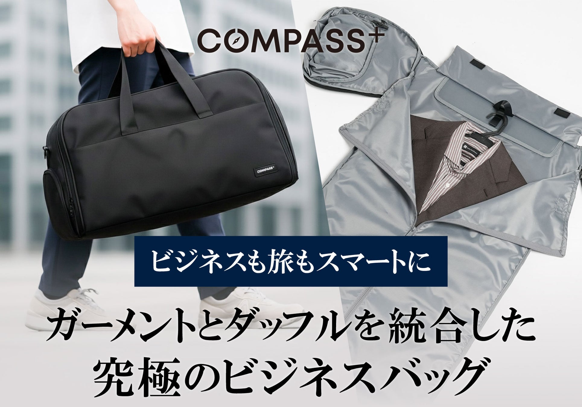 短期出張や週末の冠婚葬祭など、スーツやジャケットが必須のシーンにおいて「着替えや靴を入れるバッグ」と「シワ防止のガーメントバッグ」の2つを持つ煩わしさは、ビジネスマン共通の課題でした。また、バッグの中で大切な一着にシワがついてしまうストレスも少なくありません。COMPASS+は、こうしたビジネスシーンにおける小さなストレスを解消し、『スーツも着替えも、1つのバッグでスマートに持ち運びたい』という想いを形にするため、機能性・デザイン・耐久性を兼ね備えた本製品「ガーメントダッフルバッグ」を企画・開発いたしました。