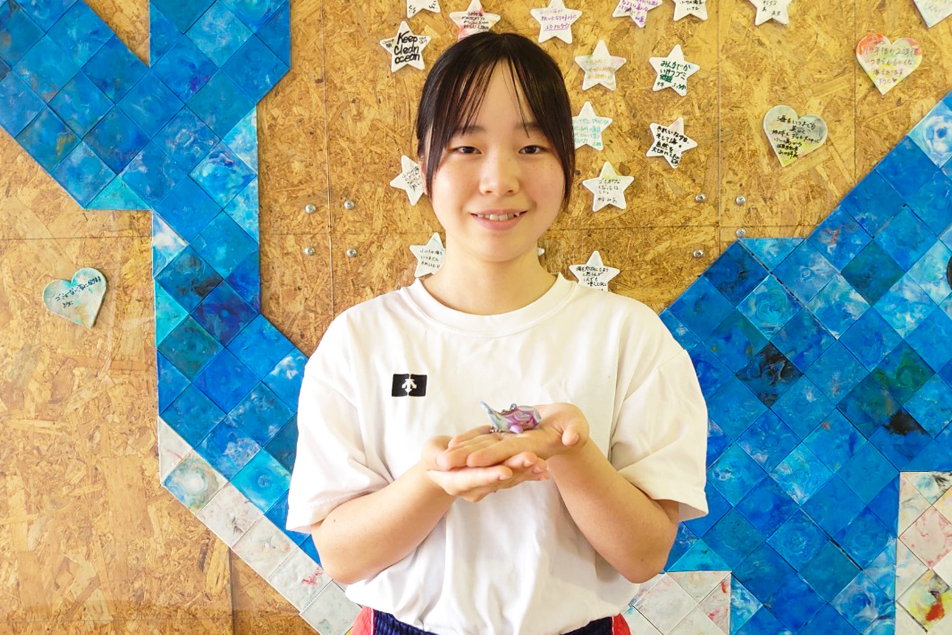 このクジラ型キーホルダーは、前年に実施された「おがわプロジェクト」の一環として制作され、海洋ごみの問題を学んだ小川小中学校の生徒たちに、**自分たちが関わった素材が姿を変えて戻ってくる“循環の象徴”**として届けられました。
