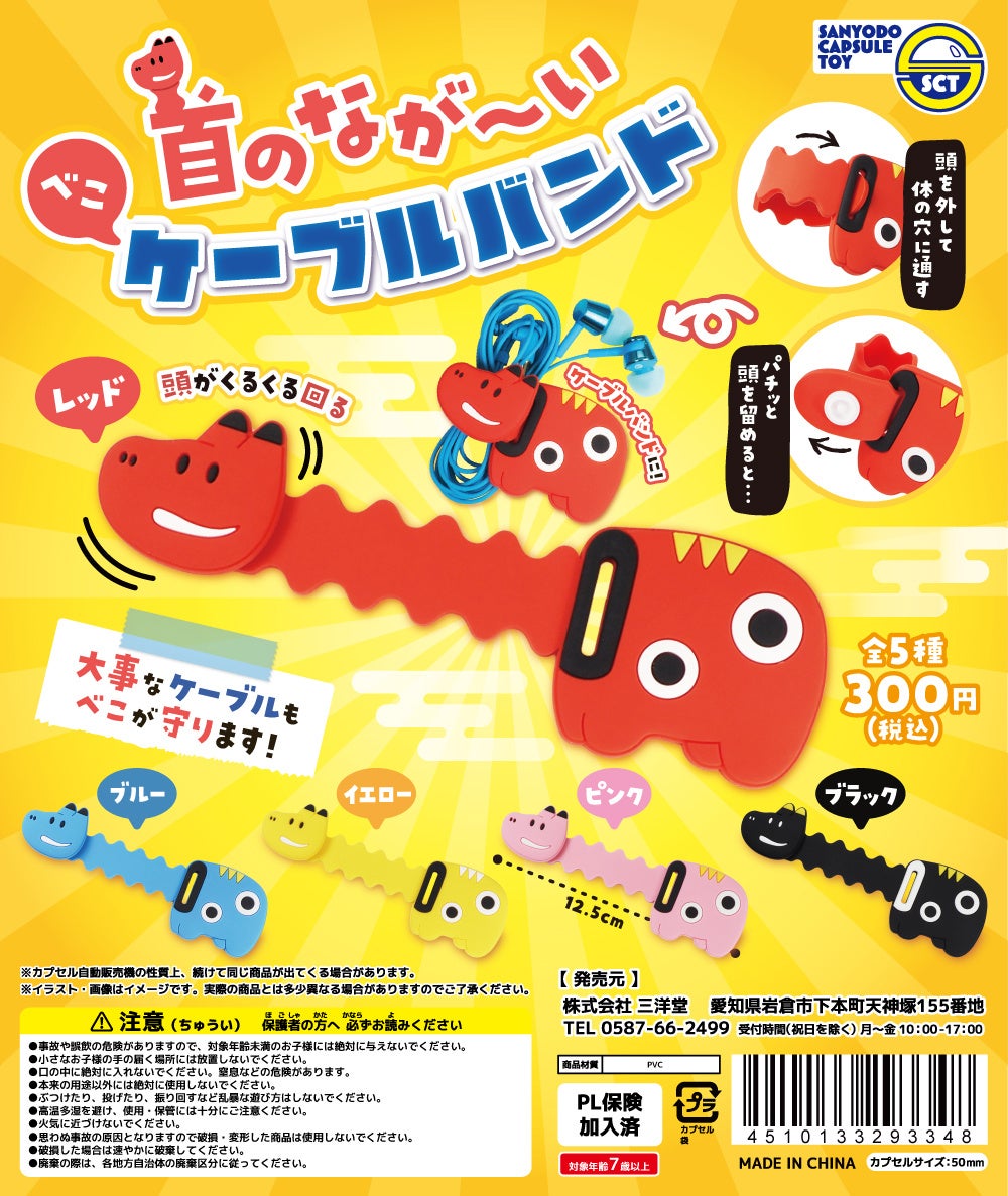 縁日商材をはじめとする玩具等の製造販売を行う株式会社三洋堂(本社:愛知県岩倉市、代表取締役:折小野 嘉輝)は、カプセルトイの新商品『首のなが~いべこケーブルバンド』全5種を、2026年2月9日(月)より全国のカプセルトイ自動販売機で1回300円(税込)にて順次発売を開始いたします。