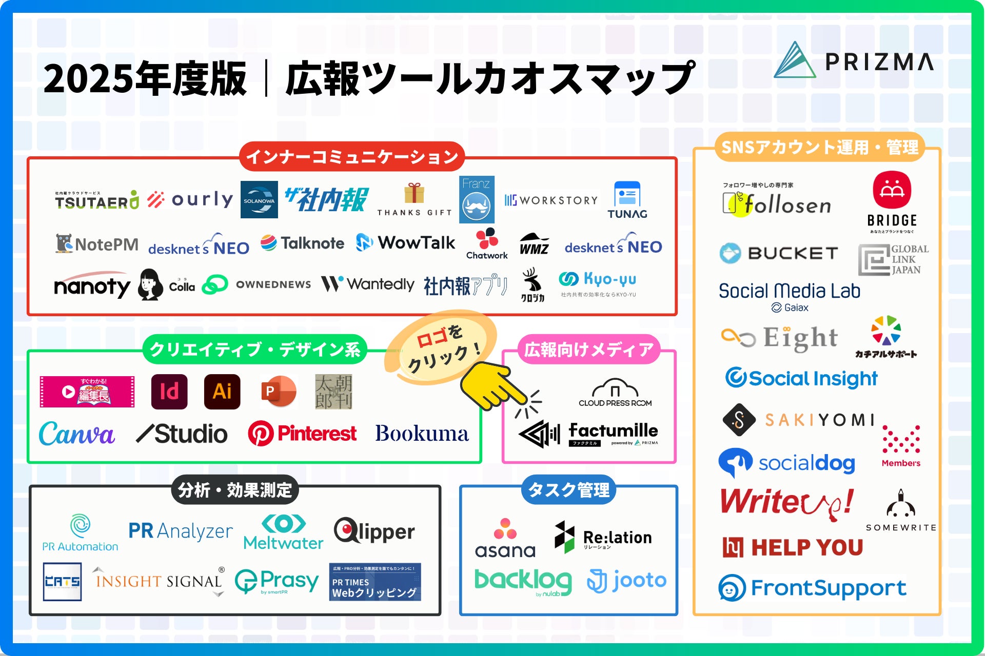 ファクトデータでマーケティングを加速させる「PRIZMA|調査リリース」(https://www.prizma-link.com/press)を提供する株式会社PRIZMA(本社:東京都渋谷区 代表取締役:杉本 昂輝 )は、広報・SNS運用・社内コミュニケーション領域を支援する各種ツールをまとめた「広報ツール カオスマップ 2025年版」を公開いたしました。