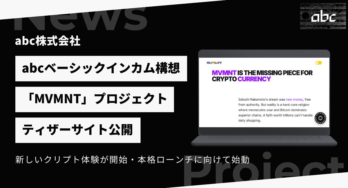 abc株式会社(本社:東京都港区、代表取締役:松田 元、証券コード:8783、以下「当社」)は、2025年12月24日付で公表いたしました「abcベーシックインカム構想」について、当社が支援する「MVMNT(ムーブメント)」プロジェクトのティザーサイトを、2026年2月13日に公開いたしましたので、お知らせいたします。
