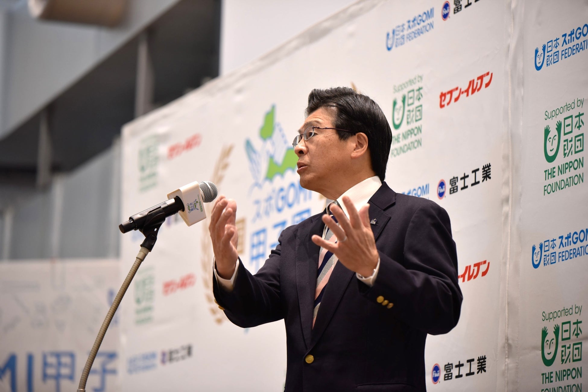 観客や関係者が見守るなか、全国から集まった代表選手たちが次々と入場した会場は、期待と高揚感に包まれました。開会式で来賓代表挨拶を行った山本 亨墨田区長から、「海洋汚染は“課題”ではなく“問題”という段階にあります。スポGOMI甲子園を通じて全国に対して、皆さんが頑張っている姿を伝えていきたい。参加者の皆さんから、日本のピンチ、危機を救ってくれる人が現れたり、環境問題をリードしていけるかたが出てくることを期待しています」とのお言葉をいただき、つづく主催者挨拶では日本財団スポGOMI連盟の玉澤 正徳代表理事が大会の意義と選手へのエールを述べました。