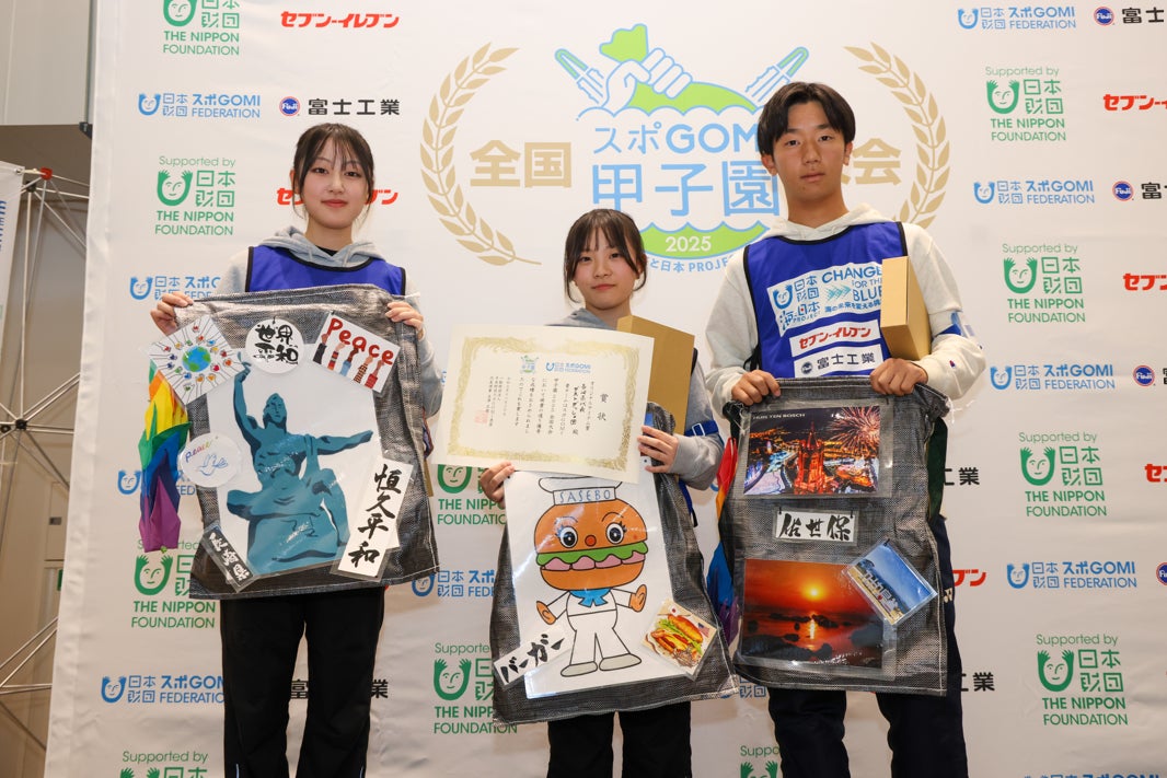 スポGOMI甲子園では、参加チームが独自に考えて制作したごみ拾いアイテムを使用することができます。重視するポイントは、1)意外性/実用性の高いアイテム 2)背景のストーリーが分かるアイテム 3)できるだけ環境に配慮した素材で製作したアイテム。これらの観点で審査を行い、今年度オリジナルアイテム賞を受賞したのは、長崎県代表「ダストダッシュ団」チームでした。丈夫な土嚢を利用しつつ、昨年はリュックタイプで入れにくかったため、今年はショルダー型に改善。実用性だけでなく平和を願い、郷土愛を感じるアイテムで見事受賞となりました。
