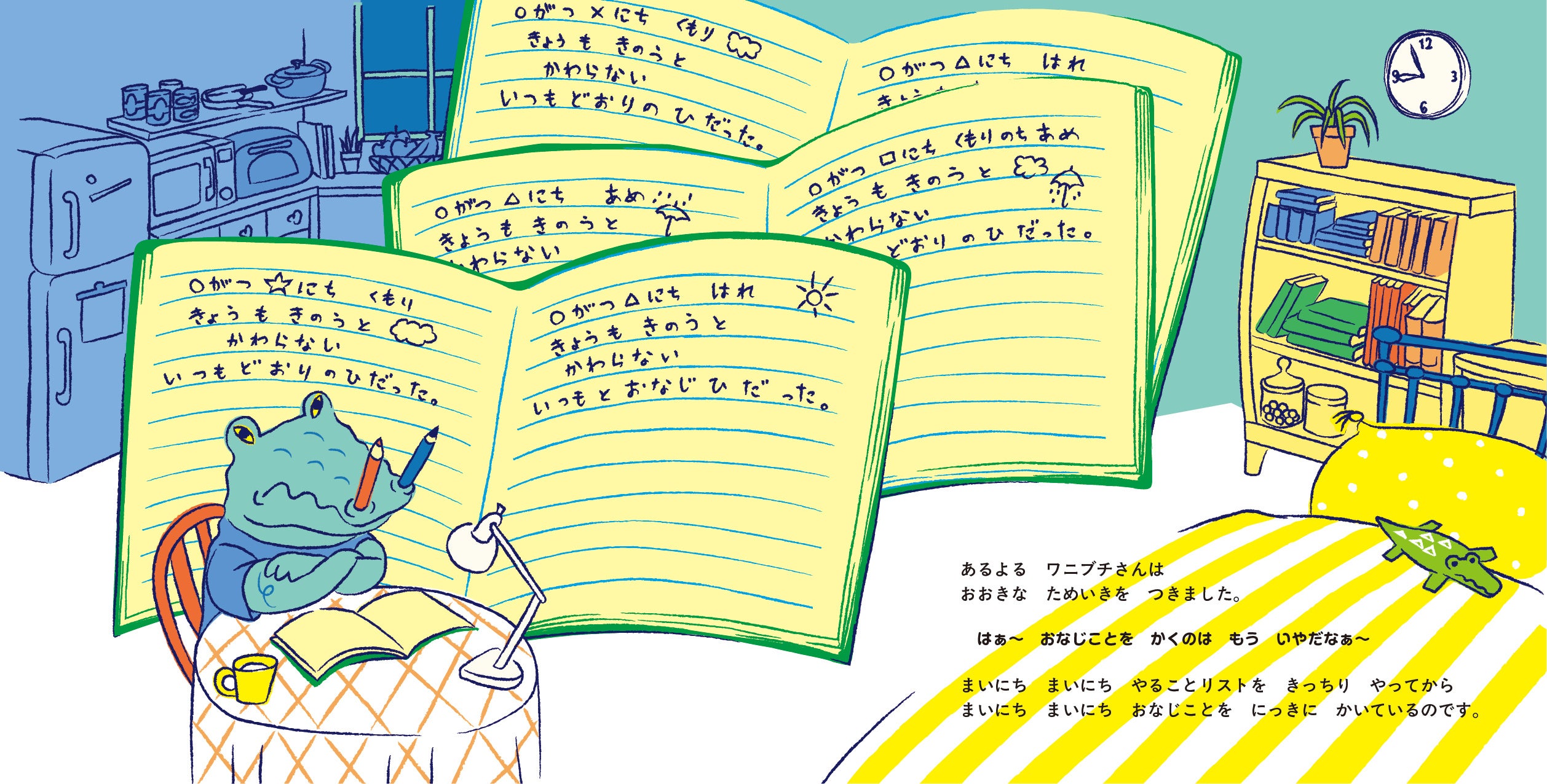 でも、ある日ワニブチさんは特別な出来事を日記に書きたくなるんです。