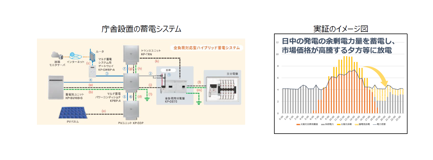 設備です。災害時のための蓄電量を確保しつつ、太陽光発電によって発電した電力のうち庁舎内で消費しきれない電力を蓄え、夜間等にも活用できるように運用するなど柔軟な制御を行うためのシステムの有効性を検証することを目指します。