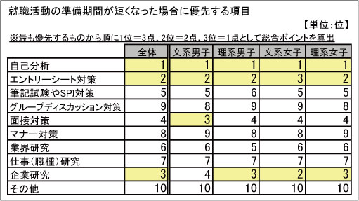 企業へのエントリーや企業研究などを開始した時期は、「3年(院1年)の10月」が半数を超え、50.3%であった。次に割合が高かったのは「3年(院1年)の6月」で11.0%。インターンシップの開始などに伴い活動を始めた学生が多かったようだ。また、実際に就職活動を行ったうえで最適だと思う時期についても、「3年(院1年)の10月」が31.7%と最も高い割合であった。さらに、3年生の10月以前を選択した学生は6割を超え、就職活動をじっくり行いたいと考える学生が多数存在することが分かった(参照:参考グラフ③)。学生からは就職活動短期化による企業研究不足や短期集中による負担の増大、ミスマッチの発生に対する危機感などを心配する声が多く、準備に余裕を持ちたいと考えているようだ。また、就職活動の準備期間が短くなった場合、準備で優先する項目上位3つを聞いたところ、1番目が「自己分析」、2番目が「エントリーシート対策」、3番目が「企業研究」となった(参照:参考グラフ④)。今後、就職活動が短期化された際、自己分析や選考の対策を優先し、十分な業界研究や企業研究を行わずに選考に挑む学生が増える恐れがある。