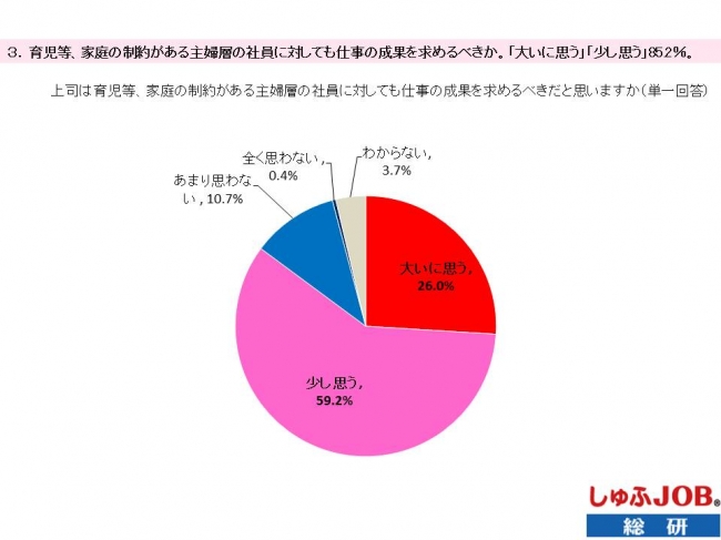 - 3.育児等、家庭の制約がある主婦層の社員に対しても仕事の成果を求めるべきか。「大いに思う」「少し思う」85.2%。