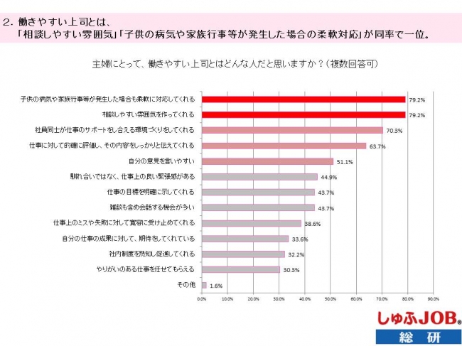 - 2.働きやすい上司とは、「相談しやすい雰囲気」「子供の病気や家族行事等が発生した場合の柔軟対応」が同率で一位。