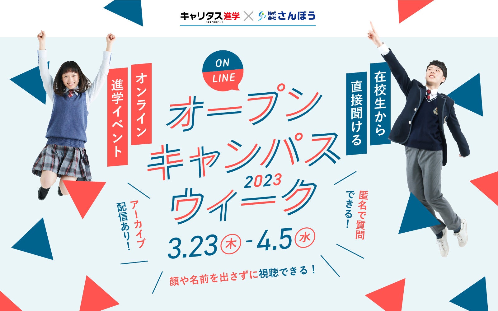 高校生向け進学イベントを手掛ける株式会社さんぽう(本社:東京都渋谷区、代表取締役社長:渡邉王雄)と高校生向けに進学情報サイト「キャリタス進学」を運営する株式会社ディスコ(本社:東京都文京区、代表取締役社長:新留正朗)は共同で、在校生から直接話を聞けるオンライン進学イベント「オンラインオープンキャンパスウィーク2023」を2023年3月23日より2週間にわたって開催します。全国200以上の学校が「学校紹介」「学部・学科紹介」「在校生のリアルな話」「高校生からの質問に回答」などの内容でお届けします。