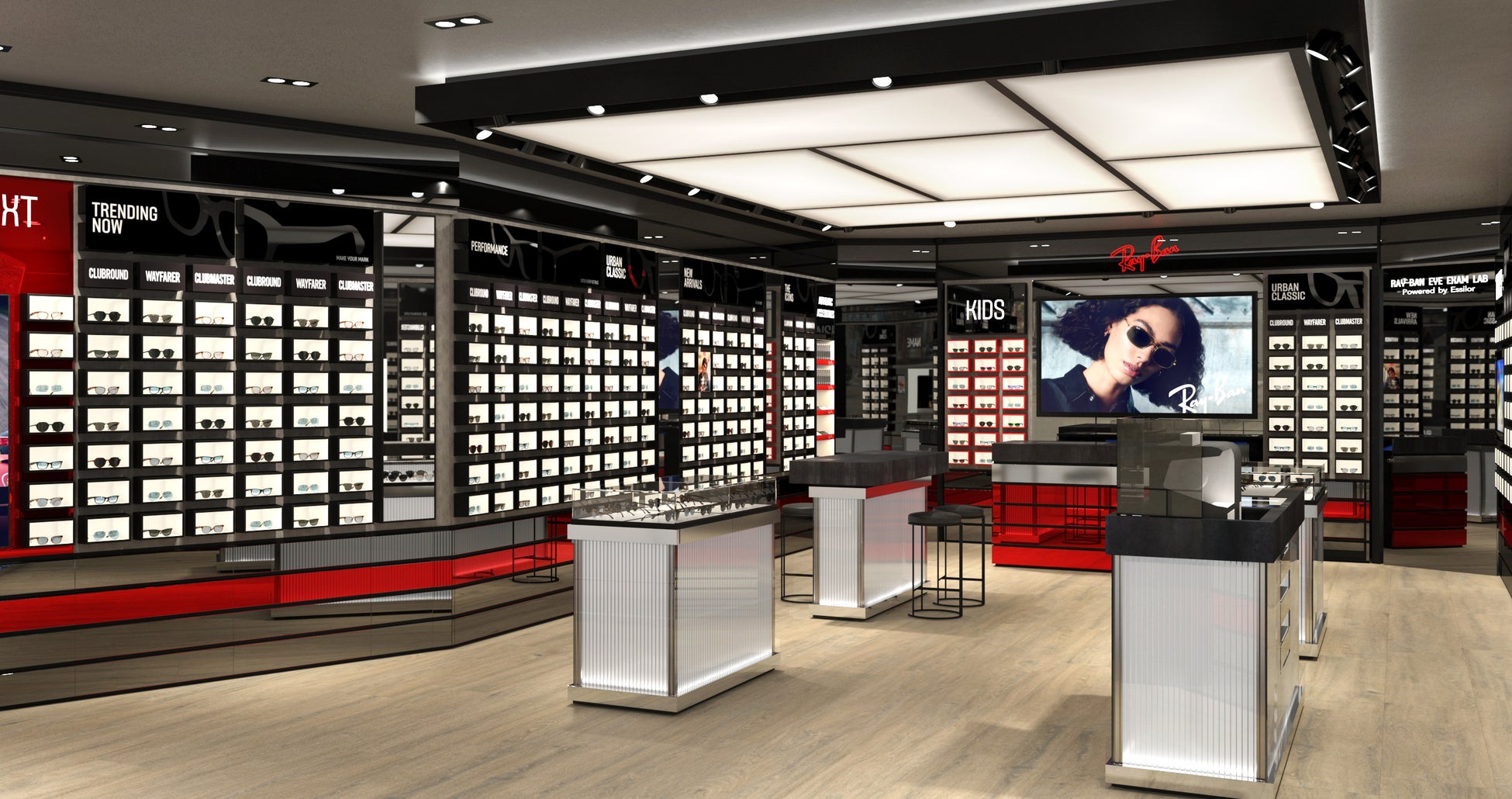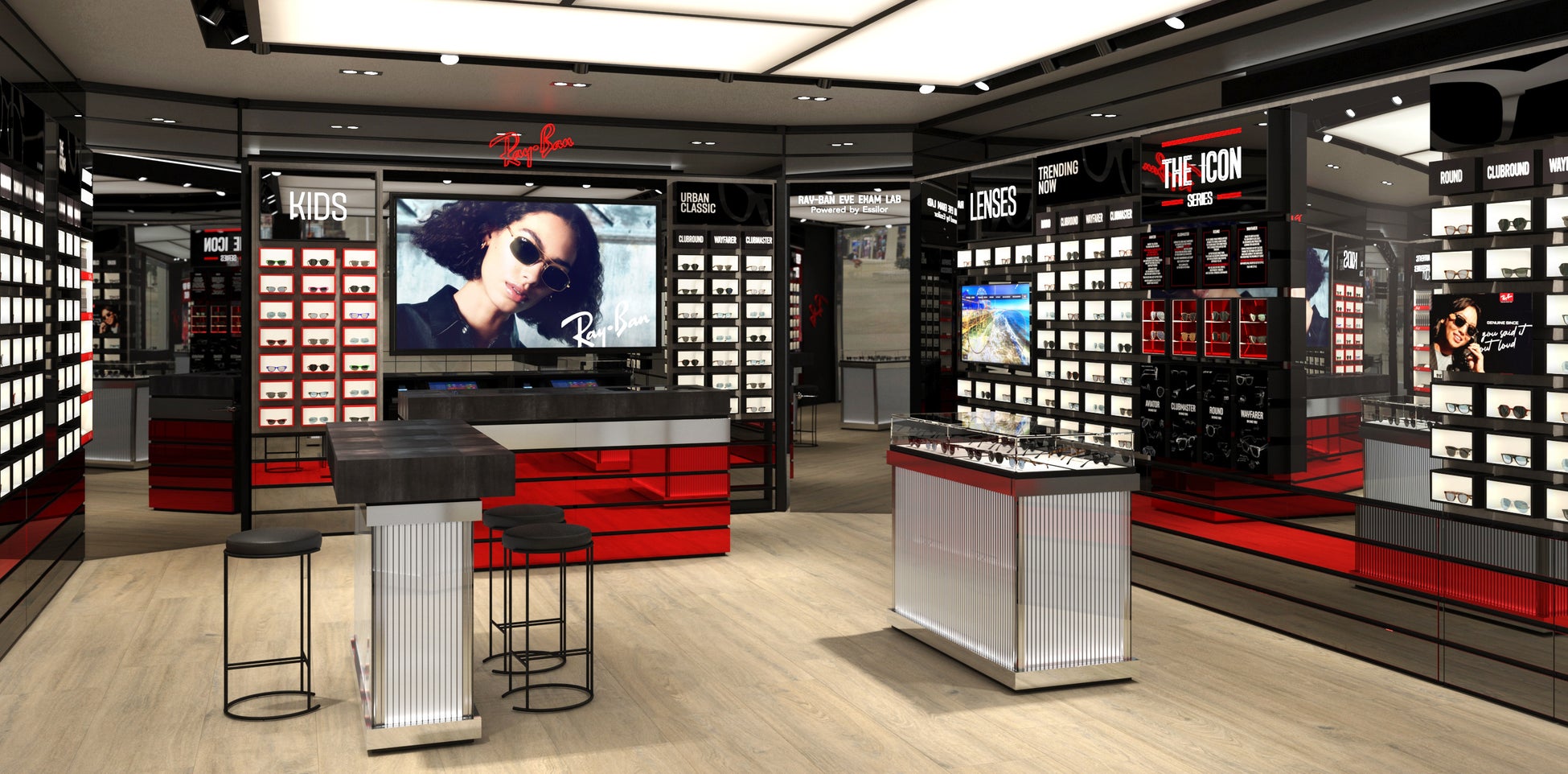 レイバンはブランド創立以来、革新的なレンズテクノロジーとフレームデザインをブランドのコアとしており、タイムレスでオーセンティックなデザインと独自のスタイル、そして自由な発想を大切にしています。畳をイメージした照明や禅のイメージを醸し出す木製の床などの日本的なデザイン要素と、デジタルスクリーンやオリジナルの照明などのテクノロジーを通合させ、新たに生まれ変わった店内は渋谷のモダンで未来的な雰囲気と調和しています。