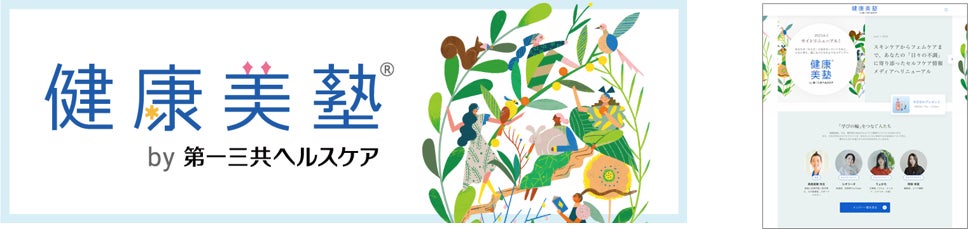 「健康美塾」は2010年から第一三共ヘルスケアが運営するセルフケア情報メディアです。これまで、季節に応じたスキンケアやからだの症状に対処する自社製品の情報を中心に発信してきましたが、このたび「『からだ』のことをともに考え、道しるべになる情報を届ける」をコンセプトに全面リニューアルしました。