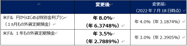 また当行は、2022年7月19日より、円からはじめる特別金利プラン(1ヵ月もの外貨定期預金)、および1年もの外貨定期預金の金利を引き上げました。いずれも為替手数料引き下げキャンペーンにて、円から米ドルへ為替手数料0円でお預け入れいただけます。