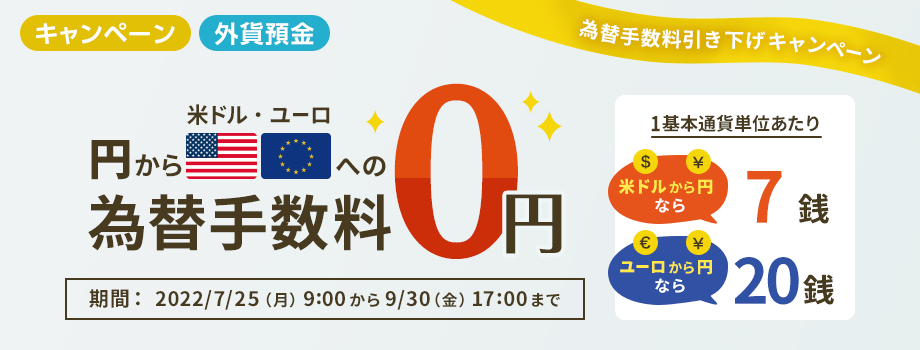 当行は「顧客中心主義の徹底」という基本コンセプトの下、近時の為替相場の動向をうけて外貨預金取引が大幅に増加している状況を踏まえ、お客さまのニーズにお応えすることを目的に、2022年7月25日(月)より以下の通り為替手数料引き下げキャンペーンを実施いたします。