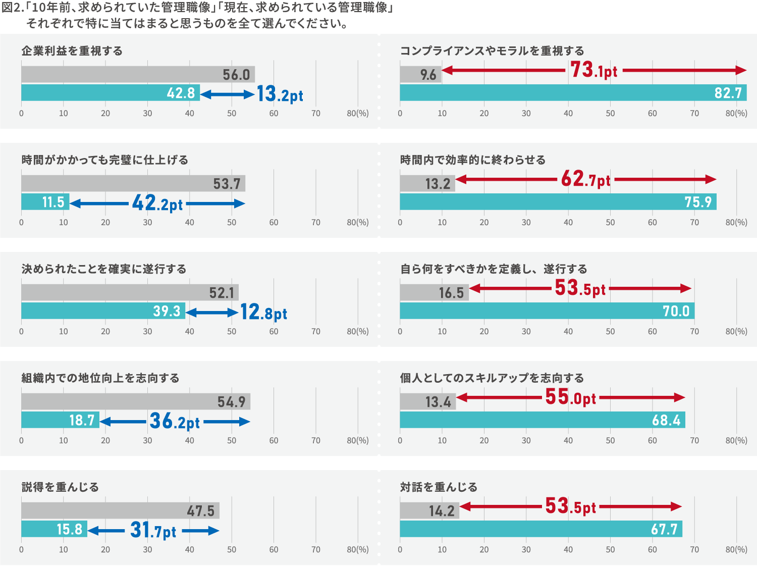 2.コンプライアンスやモラルを最重視。また正解を持つ管理職像から、自身もプレイヤーとしてスキルアップを続けながら、対話を通じ正解を一緒に考える管理職像へと変化